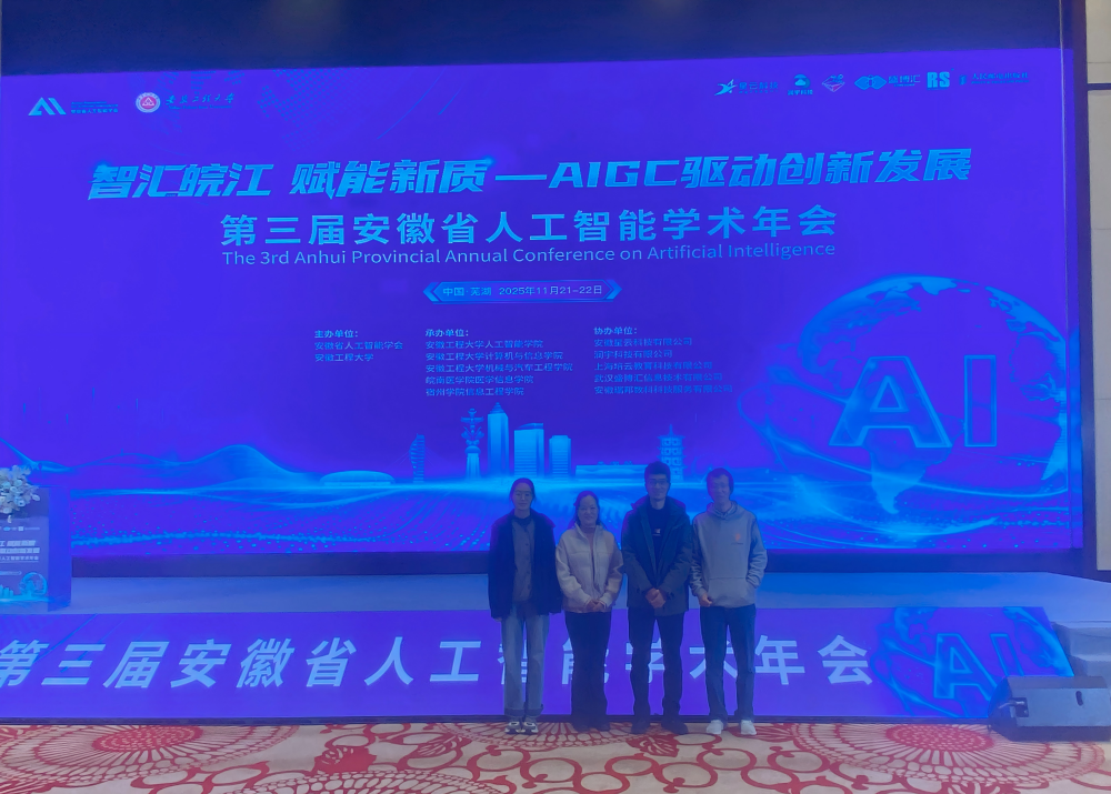 本网讯(通讯员:李红梅)2025年11月21-22日,以“智汇皖江,赋能新质——AIGC驱动创新发展”为主题的第三届安徽省人工智能学术年会在安徽省芜湖市隆重举行。本次年会汇聚了省内外人工智能领域的顶尖学者、产业专家及高校师生,共同围绕AIGC(生成式人工智能)等前沿技术,探讨其在推动新质生产力发展、赋能产业创新中的核心作用。安徽新华学院大数据与人工智能学院副院长刘磊、数据科学与大数据专业负责人李红梅、骨干教师杨亮和青年教师沈薇参加了此会议。