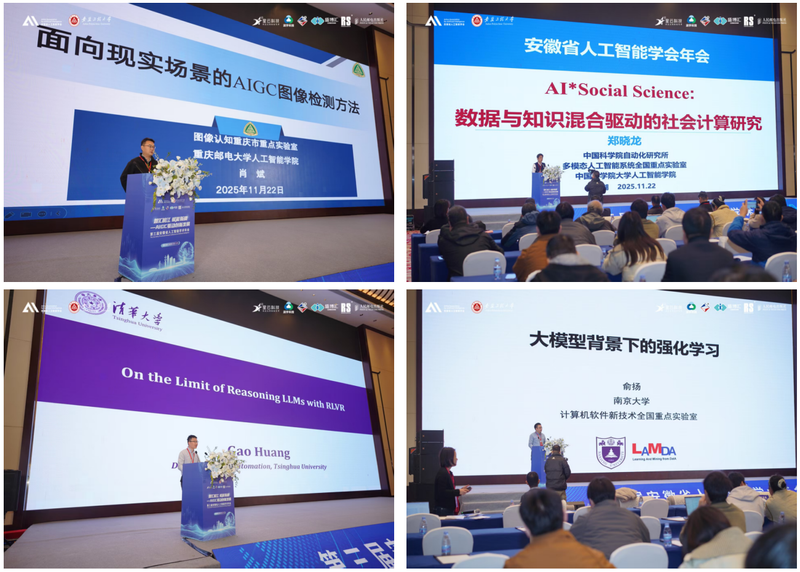 会议在特邀报告环节拉开帷幕,来自国内多所知名高校与研究机构的专家分享了最新研究成果与发展见解。重庆邮电大学教授肖斌、中国科学院自动化研究所研究员郑晓龙、清华大学博导黄高、南京大学教授俞杨分别就面向现实场景的AIGC图像检测方法研究、AI*Social Science:数据与知识混合的社会计算研究、推理大模型的能与不能、大模型背景下的强化学习等议题作了精彩报告,为与会者带来前瞻性的学术观点与技术展望,现场交流热烈,学术氛围浓厚。