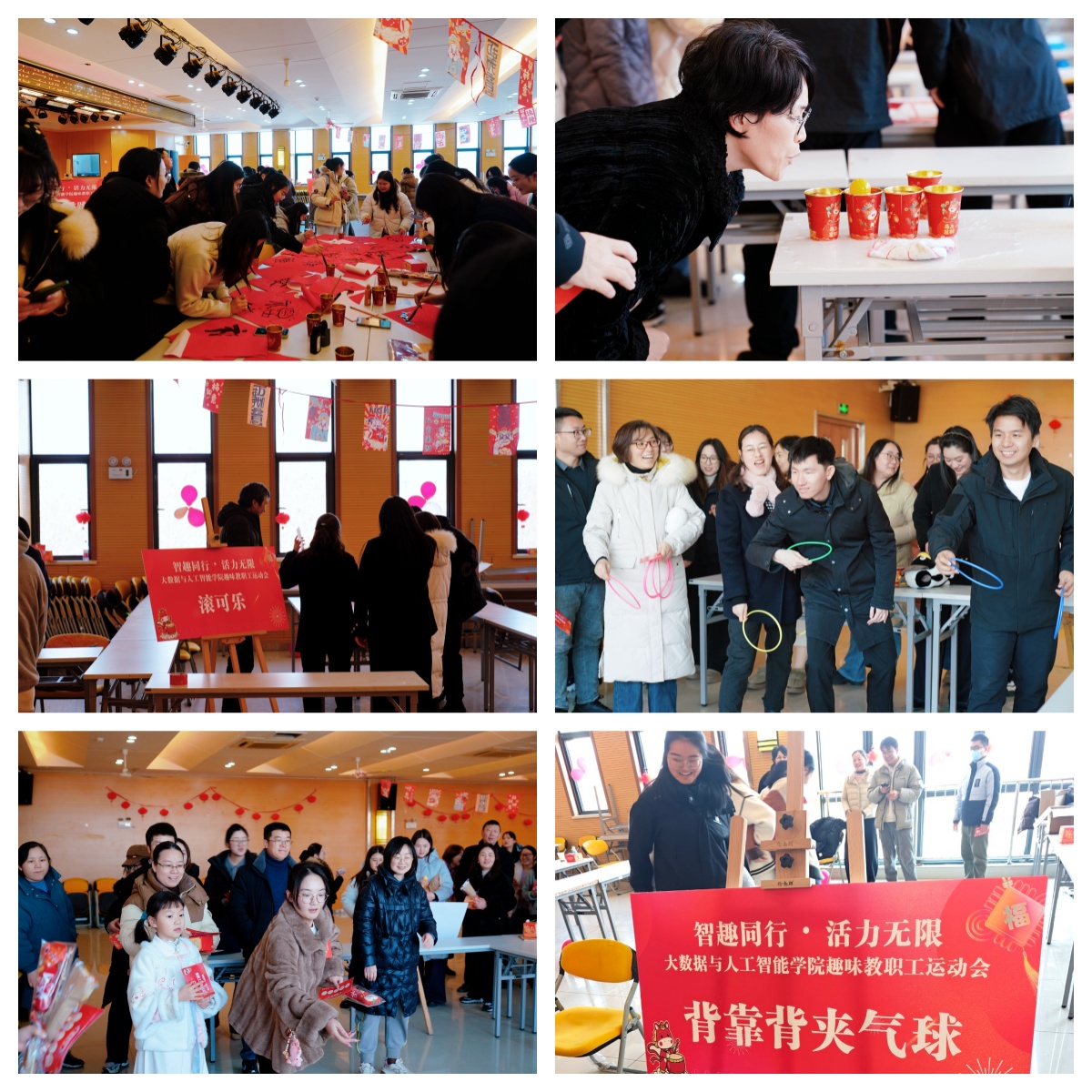 当天下午,学院在小礼堂举行“智趣同行,活力无限”教职工趣味运动会。老师们现场书写春联,翰墨飘香,年味十足。滚可乐、夹气球、套圈、袋鼠跳、吹乒乓球过水杯等趣味项目相继展开,教职工们踊跃参与,现场欢声笑语不断,气氛热烈。活动有效营造了喜庆祥和的节日氛围,增强了团队凝聚力。