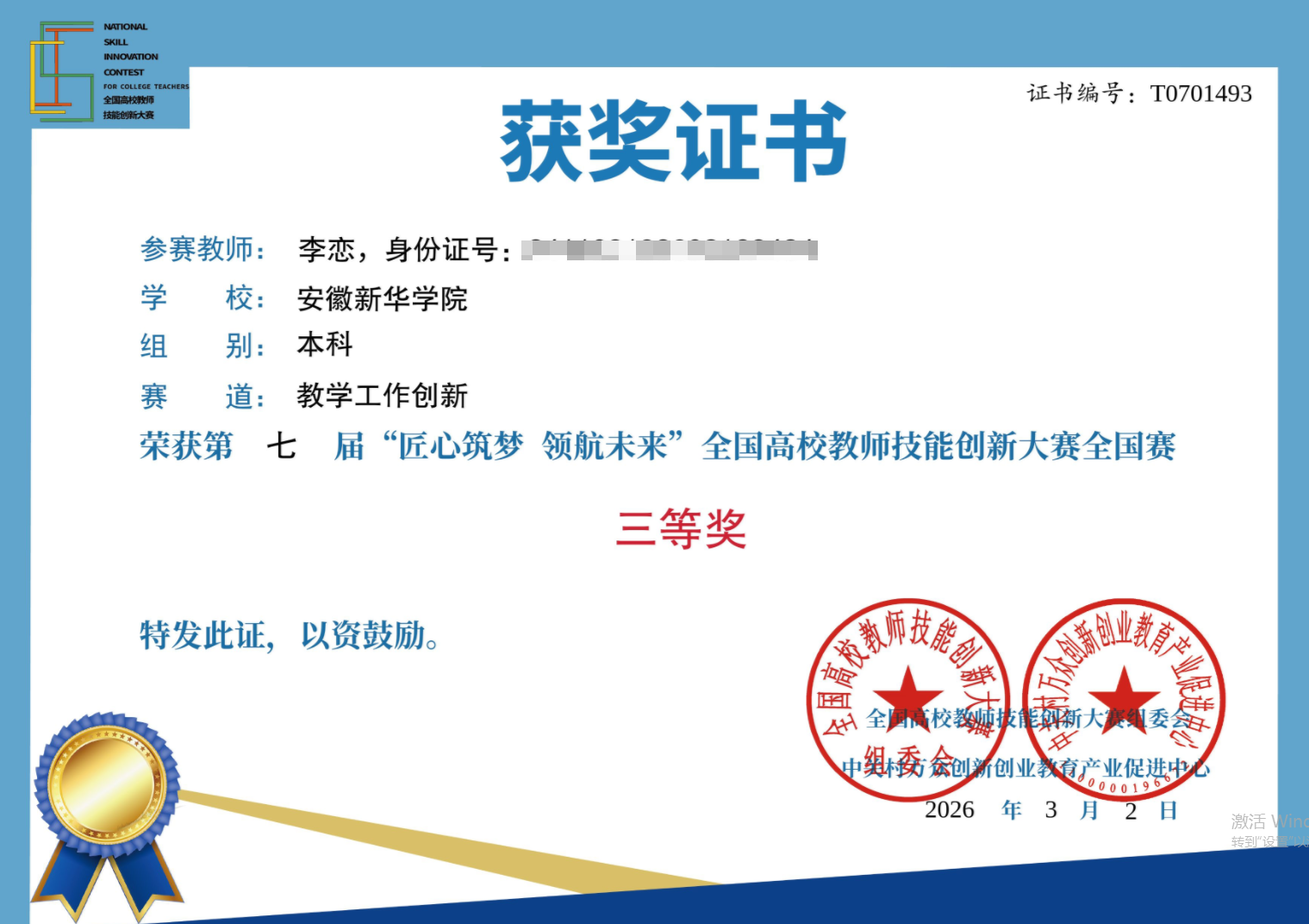 本网讯(通讯员 李恋)2026年3月2日,第七届全国高校教师技能创新大赛圆满落幕。从大赛组委会传来喜讯,我校李恋教师凭借题为《“双轮驱动、三维四阶、人机协同”教学体系——软件开发类课程教学技能创新报告》的创新成果,经过层层选拔与严格评审,最终荣获国家级三等奖。这是我校教师首次在该项全国性赛事中斩获国家级奖项,标志着我校在教育教学创新,特别是新工科背景下的人才培养模式探索上,迈出了坚实而有力的一步。