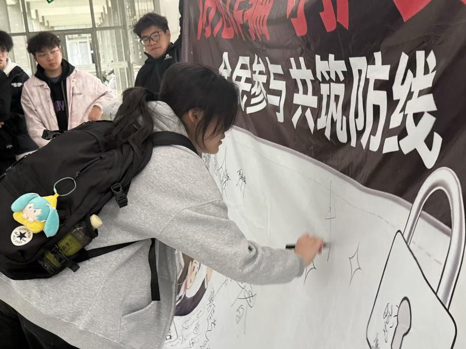 活动期间,学院在校园内组织开展反诈签名活动。现场设置宣传横幅和反诈知识展示区,团总支学生干部主动向过往同学发放宣传资料,讲解常见电信诈骗手段及防范要点,引导同学们在横幅上郑重签名,表达自觉防范诈骗、守护财产安全的决心。活动吸引了大批学生参与,现场秩序井然,氛围热烈。