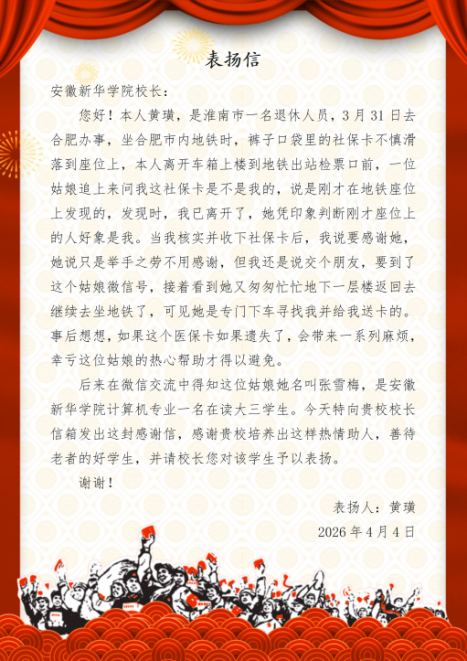 本网讯(通讯员:张韬)近日,一封来自淮南市退休市民黄璜的感谢信寄至安徽新华学院校长信箱。信中,黄先生深情讲述了我校学生张雪梅拾金不昧、主动寻人的暖心事迹,对学校育人成效给予高度赞扬。