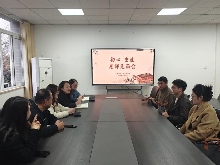 分享会后,活动随即转入温馨感人的“初心-重逢”恩师见面会环节。三位校友与他们的辅导员老师苏丽、卞振、葛瑞琦以及学院领导、老师们围坐一堂。校友们向老师们汇报了各自在研究生阶段的学习进展、科研收获与校园生活,畅谈从母校毕业后的成长与蜕变。老师们则悉心聆听,关切询问,并与校友们共同追溯起当年在校时的生动趣事和美好记忆。一幕幕往事重现,欢声笑语中充盈着浓浓的师生情谊,现场气氛亲切而热烈。